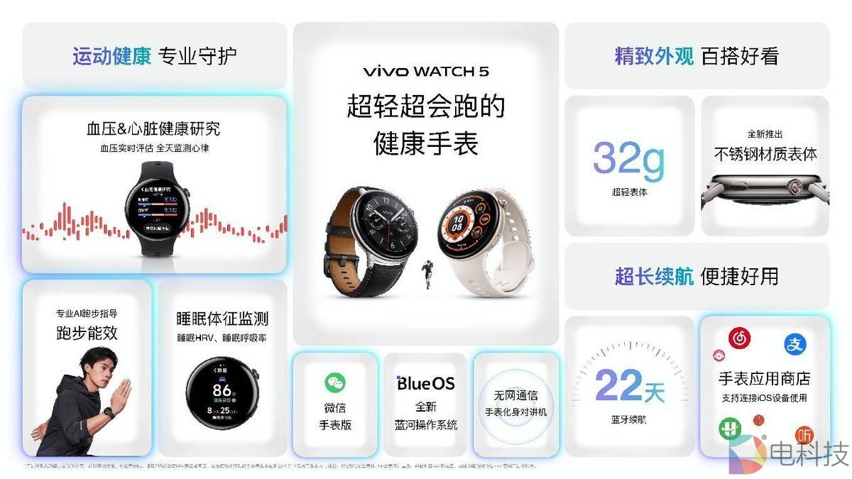 “超轻超会跑”的智能穿戴新品vivo WATCH 5,不仅搭载专业AI跑步指导,还有无感血压风险评估,刷新专业运动监测与健康监测的新高度。凭借其最低仅32g的超轻量级金属机身,至长22天蓝牙续航,为用户带来全场景、高品质的腕上智慧体验。vivo WATCH 5已在vivo官网及各大电商平台开启预售,并将于4月29日正式开售,价格799起。首销期间在各大电商平台购机可享国补优惠,低至679.15元起。