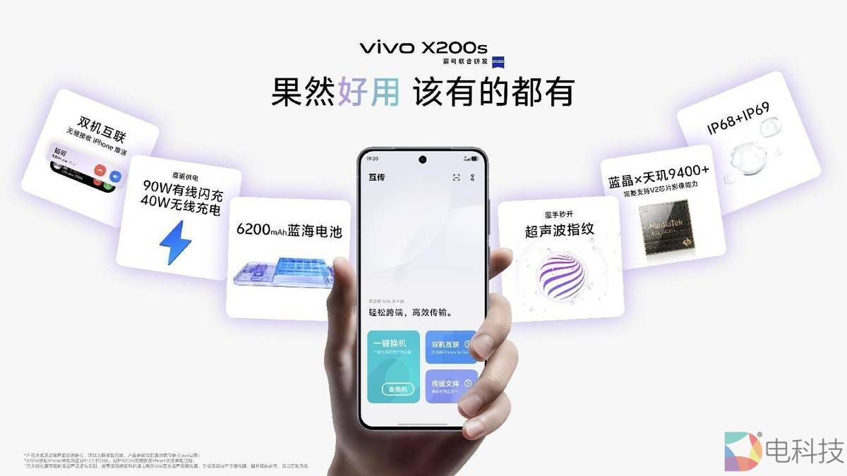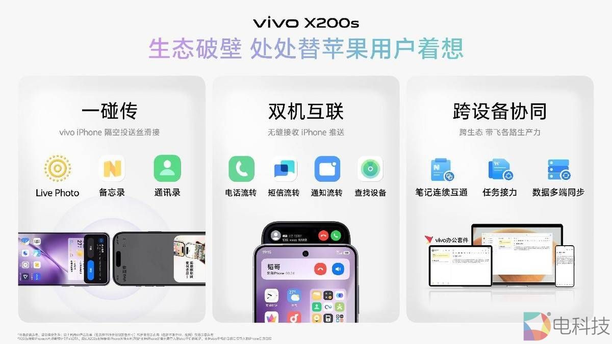 不仅好看,还更好用。vivo200s进一步打破了安卓系统与iOS的生态之墙,为双持用户带来了“双机流转”功能,基于该功能,用户可以通过vivo互传实现两台手机之间的来电通知流转、短信流转、通知流转、设备双向查找,再也不用担心错过重要信息,双持如单持,让用户丢掉双持的“麻烦”,尽享愉悦。同时,vivoX200s还支持与iPhone之间进行照片、视频、文件、日程等信息的隔空传和一碰传,帮助用户突破壁垒,分享愉悦生活。