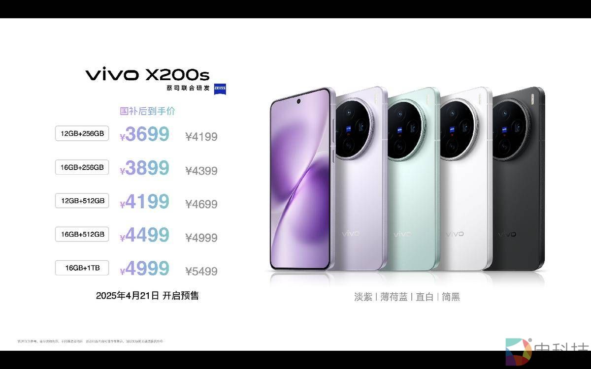vivo X200s采用淡紫、薄荷蓝、直白、简黑四款时尚配色,将于4月25日开售,起售价4199元,享受国家补贴后到手价3699元起;vivo X200 Ultra共有银调、红圈、黑Ka三款经典配色,将于4月29日开售,起售价6499元。