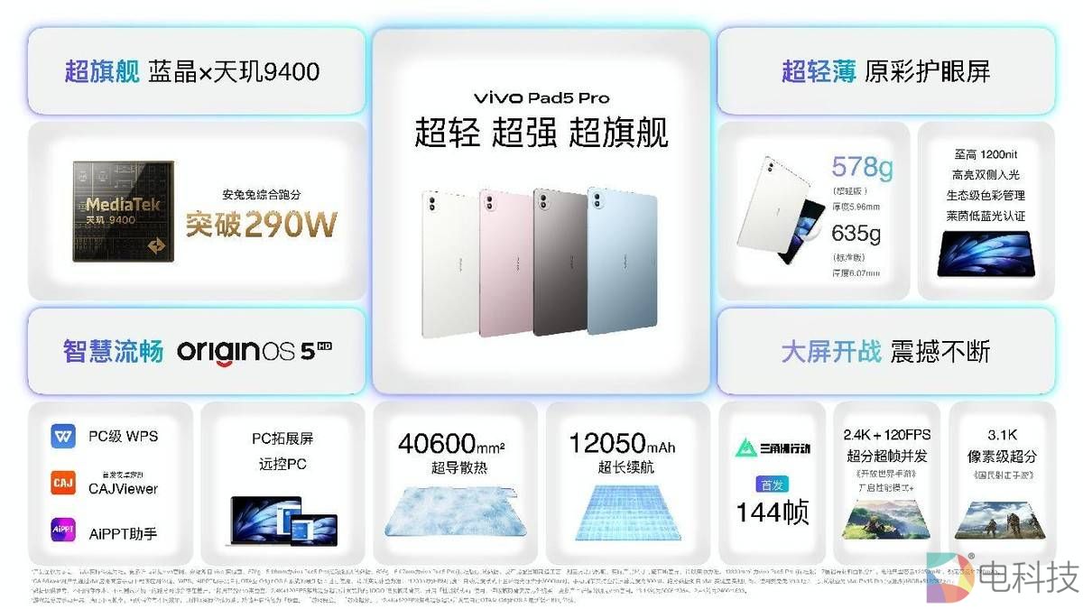 vivo Pad5 Pro作为“安卓超旗舰性能平板”,搭载安卓平板全球首发的蓝晶×天玑9400芯片,安兔兔综合跑分突破290万大关,实力演绎安卓平板性能的超强形态;再配合超轻薄原彩护眼屏,打造全场景超强显示体验。系统级蓝心大模型赋能,以及 PC 级 WPS 等专业适配,是大屏移动游戏与轻办公生产力的新选择。vivo Pad5 Pro已在vivo官网及各大电商平台开启预售,云霞粉、春潮蓝、与寒星灰三种配色将于4月25日正式开售,价格2999元起;vivo Pad5 Pro超轻版轻羽白配色将于4月29日限时开售。首销期间在各大电商平台购机可享国补优惠,低至2549.15元起。