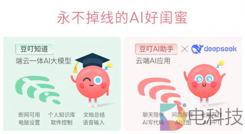 豆叮AI助手升级,接入DeepSeek大语言模型,带来聊天陪伴、全能写作、问题解答、AI写代码、AI PPT、AI绘图等诸多实用功能,成为更懂你的智能闺蜜。豆叮知道全新加入,基于端云一体AI大模型,断网也能使用,支持文档总结、个人知识库、AI识图、电脑设置、软件控制等功能,是你永不掉线的专属私人管家。