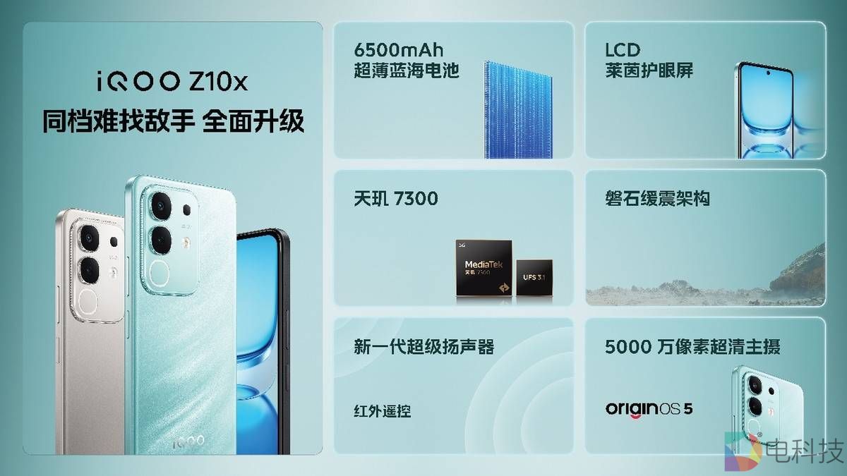 “Z x”系列迎来最强一代,iQOO Z10x 搭载采用台积电 4nm 旗舰工艺的天玑 7300,配备同档领先的 UFS 3.1以及冰封立体散热系统,支持《王者荣耀》90帧高清画质的畅玩;拥有 1050nit 全局至高亮度的 LCD 莱茵护眼屏,通过莱茵低蓝光认证,支持 120Hz 多挡变速高刷,流畅护眼;6500mAh 超薄蓝海电池、44W 闪充、直驱供电和有线反向充电,大幅领先同档;5000 万像素 AI超清主摄、红外遥控、至高 400%的立体双扬、光环呼吸灯以及薄至 8.09mm 的机身,让这款产品在同档之中亦是出挑。