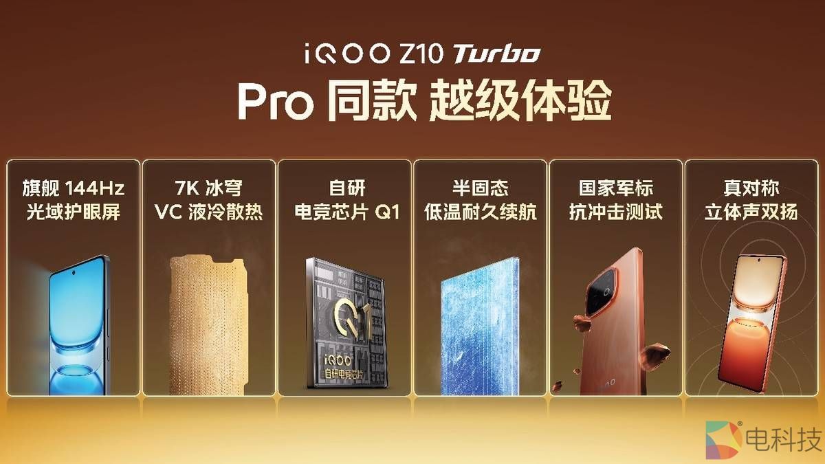 除搭载天玑 8400 满血版,iQOO Z10 Turbo 核心配置全面看齐Z10 Turbo Pro:机身厚度薄至 8.09mm,通过国家军标抗冲击测试,搭载自研电竞芯片Q1、旗舰 144Hz 光域护眼屏、24 根环绕式天线、7K 冰穹 VC 液冷散热系统、5000 万像素索尼大底光学防抖主摄以及 OriginOS 5等,还通过 KPL 比赛用机测试认证,实力亦达到 Pro 级。