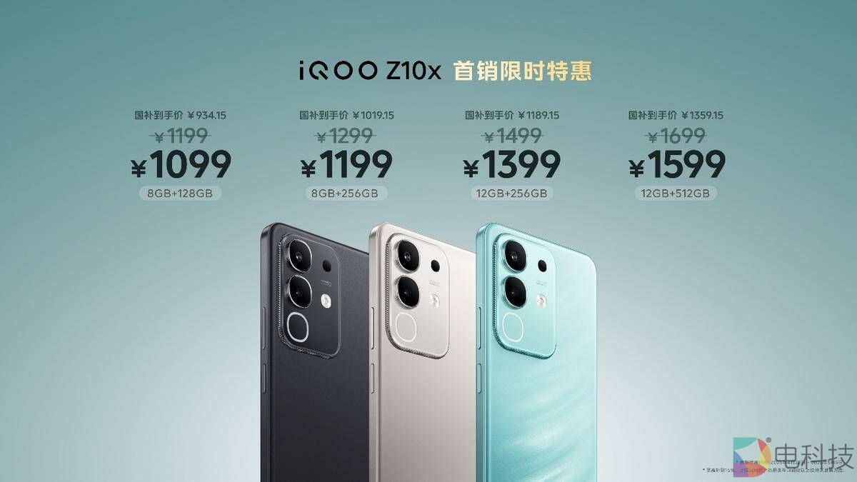 iQOO Z10x 共有“凤羽青”、“月岩钛”和“星穹黑”三种配色可选,提供 8GB+128GB、8GB+256GB、12GB+256GB 和 12GB+512GB 四种存储组合可选,到手价 1199 元起,首销限时特惠全版本减 100 元,到手价 1099 元起,国补到手价934.15 元起。