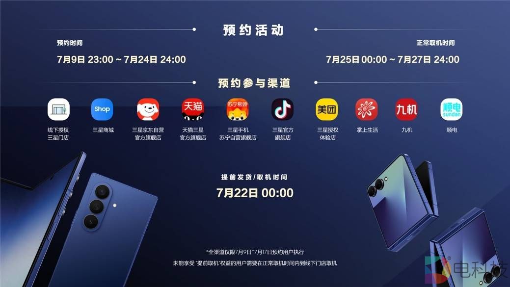 三星Galaxy Z Fold7将于7月9日23:00,在三星商城、三星京东自营官方旗舰店、天猫三星官方旗舰店、三星手机苏宁自营旗舰店、抖音三星官网旗舰店等线上渠道以及线下授权三星门店正式开启预约,并于7月25日全渠道正式开售。三星Galaxy Z Fold7提供暗影蓝、星夜银、秘影黑[23]以及青霜绿(三星商城专属颜色)[24]四种配色,厂商建议零售价13999元起。成功预约三星Galaxy Z Fold7的消费者,可有机会享受免费升杯(256GB升级至512GB)、加价1250元升杯(512GB升级至1TB)购机福利, 7月17日前成功预约的消费者还可享有提前发货权益。