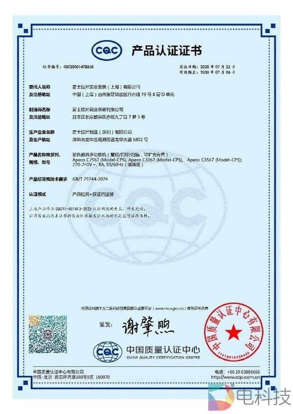 富士胶片商业创新(中国)成为首批获证企业 近日,富士胶片商业创新旗舰智能型A3彩色数码多功能机Apeos C3567/C3067/C2567获中国质量认证中心(CQC)颁发的"办公设备网络安全认证