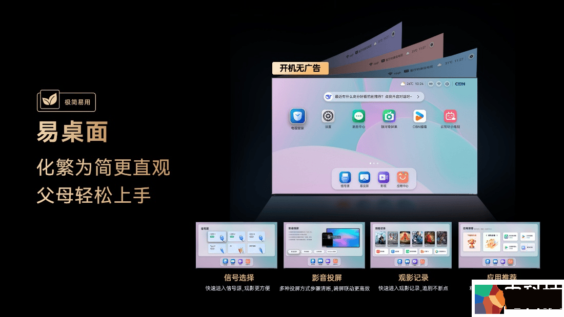 我们的父母日常不会使用智能电视,原因多在于电视的操作设计过于复杂,康佳G10易AI系统意在让操作方式更简单。它搭载了基于康佳自研百晓大模型的易AI系统,拥有简洁好用的易桌面,选择信号、影音投屏、观影记录和应用推荐四大常用功能悬浮于底栏,父母想重温前一天没看完的剧集、切换信号源、电视大屏影音快速投屏等需求都能实现两步内完成,省去了多级菜单寻找或选择的烦恼,用起来像手机一样顺手。