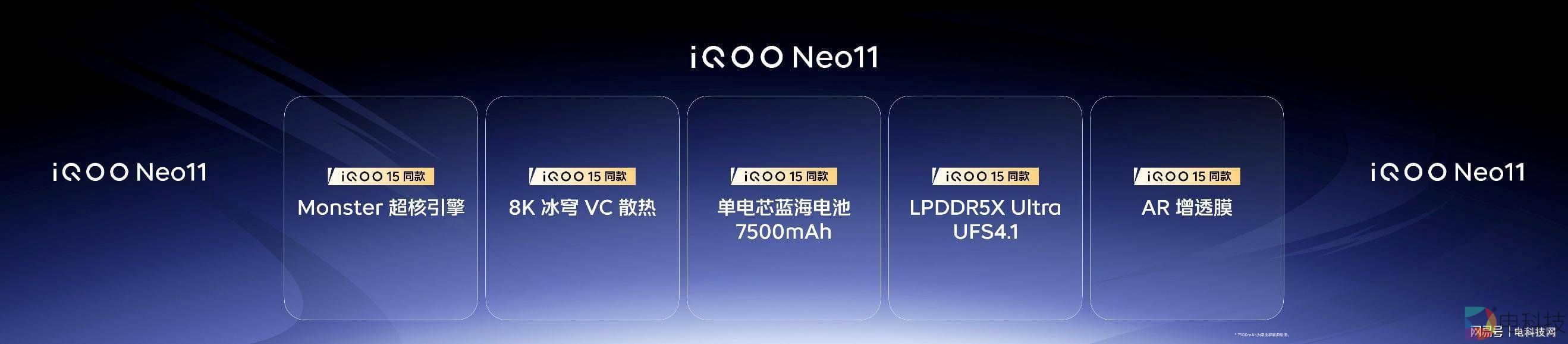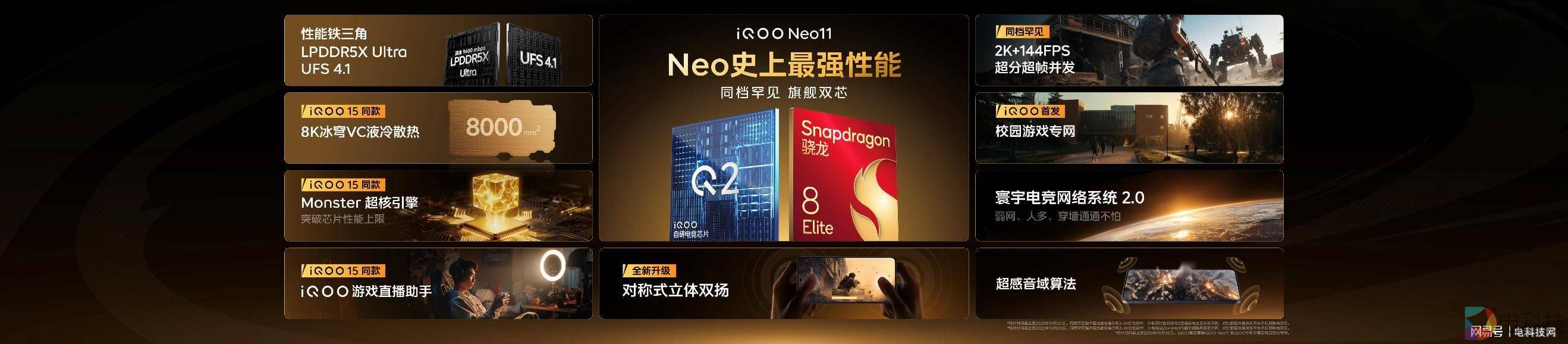 iQOO Neo11 搭载由骁龙 8 至尊版与自研电竞芯片 Q2 组成的“旗舰电竞双芯”,并在 Monster 超核引擎支撑下,带来优秀的 1% Low 帧表现、全新升级的 PC 级 2K 纹理超分、原生级 144FPS 无损超帧以及超分超帧并发,实现行业领先的游戏视效;更以 8K 冰穹 VC 液冷散热、7500mAh 超薄蓝海电池、AR 增透膜等多项 iQOO 15 同款配置、高质感金属玻璃机身和 IP68 & IP69 防尘防水等,共筑一款更优秀的强悍标准版。