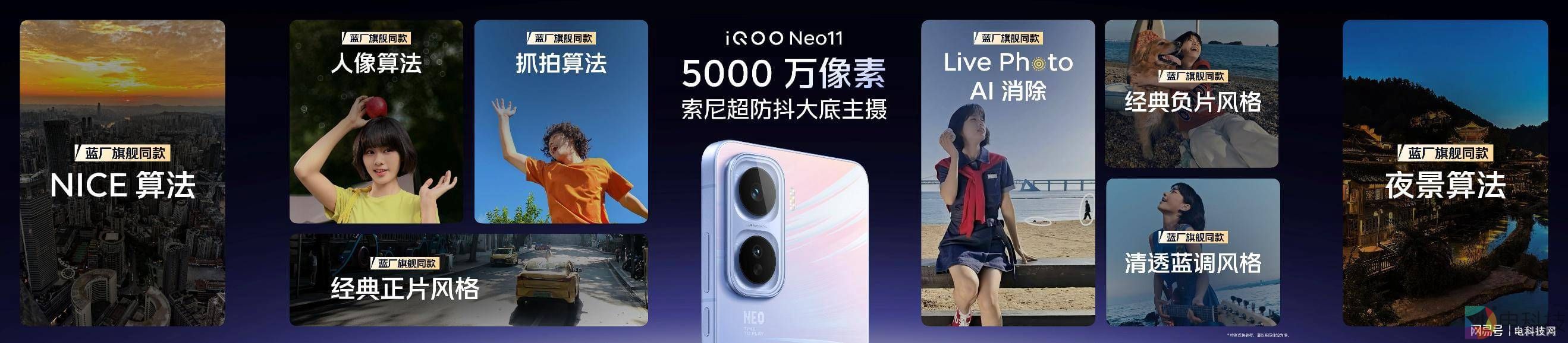 iQOO Neo11 配备后置 5000 万像素索尼超防抖大底主摄,并得到蓝厂旗舰同款 NICE 算法加持,同时影像玩法也有升级,全新的风格化光斑、负片、正片和清透蓝调等滤镜以及升级的 LivePhoto 动态照片、LivePhoto AI 消除和 AI 修图大师等,让出片更轻松。
