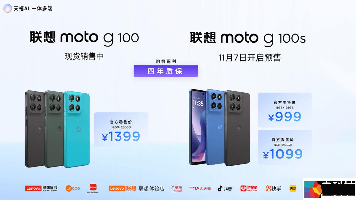 联想moto g100 AI手机已经开售,售价1399元起;联想moto g100s AI手机将于11月7日开启预售,售价999元起。喜欢LCD的朋友,一定不要错过。
