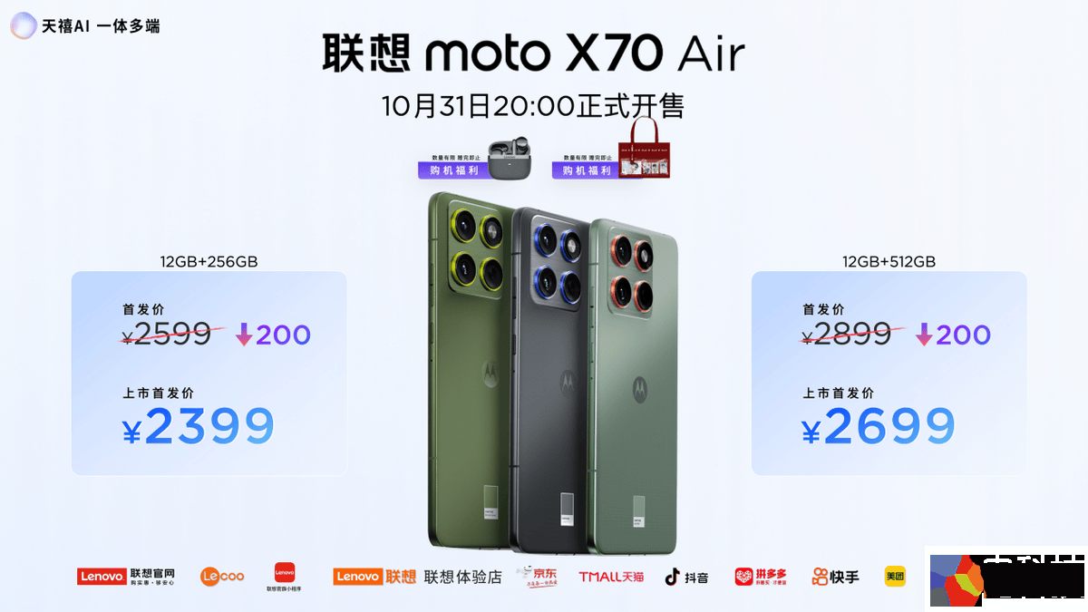 联想moto X70 Air AI手机售价2599元起,10月31日晚8时全渠道正式开售,首销福利限时优惠仅2399元起,还可享国补和平台补贴等多重优惠。