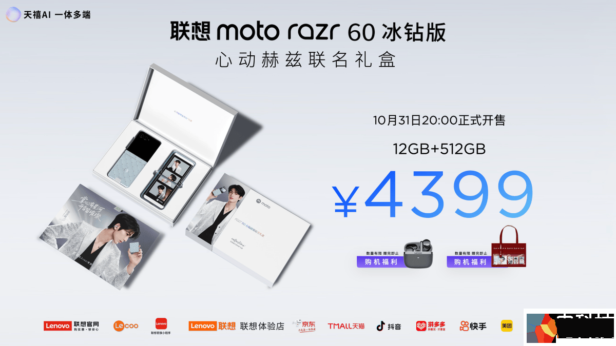 联想moto razr 60心动赫兹联名礼盒售价4399元,购买心动赫兹礼盒的用户即有机会获得“赫你相遇”限定礼袋,礼袋含张凌赫独家写真透卡、定制款痛包,以及丰富的限定周边。