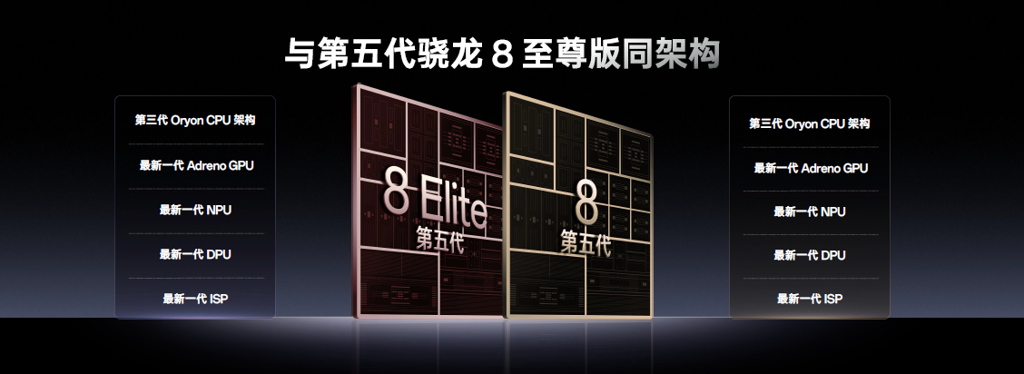 2025 年 11 月 26 日,高通技术公司正式推出本年度第二颗旗舰移动平台——第五代骁龙8,该平台搭载定制的Qualcomm Oryon™ CPU,最高主频高达3.8GHz,性能提升高达3