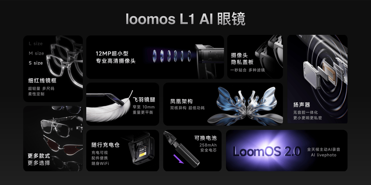 针对市面上AI眼镜在舒适度、外观、配镜等方面的用户痛点,闪极提出“AI眼镜应先成为一副美观舒适的日常眼镜”的产品主张。基于此,闪极发布“loomos 录眸 AI眼镜基座平台”及“闪极 loomos AI拍摄眼镜 L1”(以下简称:闪极 L1)。