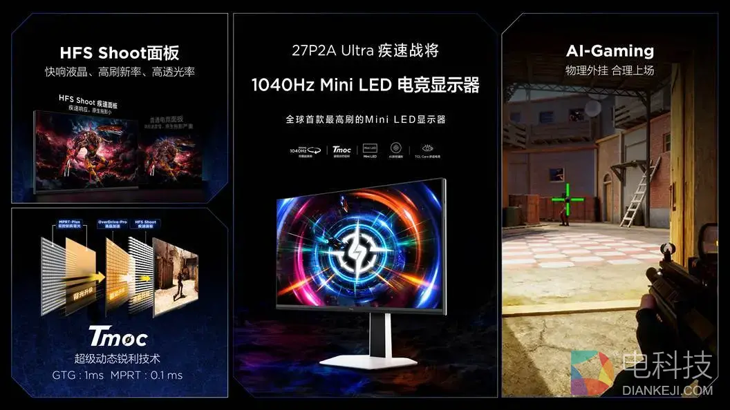 当画质已被极致提升,细节已无可挑剔,TCL带着对速度的信仰和追求,向物理感知的边界发起终极冲锋,推出全球首款最高刷Mini LED电竞显示器——“疾速战将”P2A Ultra。它的刷新率高达1040Hz!这不仅仅是一个新的突破,更是一面旗帜,背后是对“更快一秒”的电竞本能所做出的最极致、最倔强的致敬,速度不再只是数字,而是真正落到每一步操作上的顶级掌控感——拉枪跟枪、预瞄锁定精准无比,眼明手快,得心应手。