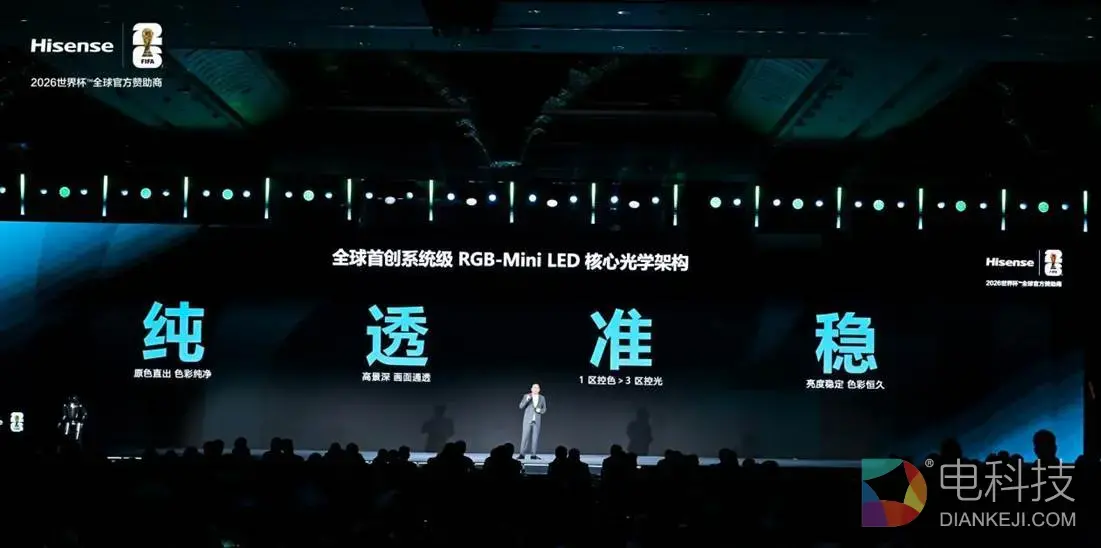作为 RGB-Mini LED 电视的开创者与引领者,海信深耕高端显示技术迭代,直击行业 “色彩受限、光晕难消、还原不准、久用褪色” 四大痛点,为 UX2026 款打造全球首创玲珑 4 芯真彩背光技术,以 “纯、透、准、稳” 的技术优势实现 1 区控色>3 区控光的颠覆式突破,从根源上解决普通Mini LED串色、色晕、偏色等行业顽疾,推动电视画质正式迈入原生色彩时代。