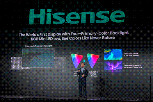 为了打破传统Mini LED和OLED的色彩、能耗及视觉舒适局限,进一步提升大屏时代显示设备的用户体验,海信一年前开创并全球最先量产了RGB-Mini LED电视,这一创新技术随着全球TOP5电视品牌悉数布局,迅速成为全球高端电视的趋势热词。“RGB与Mini LED的结合,是一场颠覆性的变革。”海信视像科技总裁李炜在今年CES的展前发布会上表示,为了还原那份无限趋近于肉眼所见的极致真实,全新一代RGB-Mini LED技术带来了三大进化。