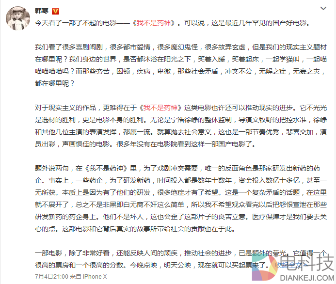 7月4日晚,韩寒在网上发表了《我不是药神》影评,他大赞,这是一部"了不起的电影,是最近几年罕见的国产电影"。他指出,当下国产片的弊病之一就是缺乏对现实社会的关注,而