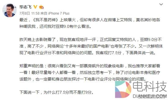 不过今日,《纯洁心灵·逐梦演艺圈》的导演毕志飞在微博发文表示,他在看完《药神》后给它客观打7.5分,而豆瓣9.0分不准,高了不少。