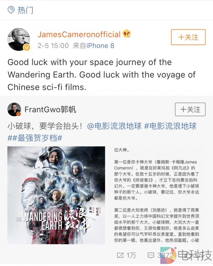 该片也收获了国际知名导演James Cameron(卡梅隆)的点赞。《流浪地球》导演郭帆自述,自己在15岁的时候,正是因为看了James Cameron拍摄的《终结者2》,才立下志向要去拍科幻片。电影上映后,James Cameron也发布微博评论称:“祝福流浪地球的太空之旅好运,祝福中国的科幻电影旅程。”