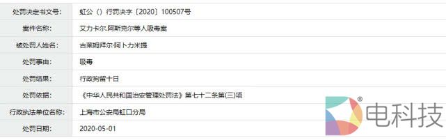 6月3日,据上海市虹口公安分局行政处罚公示名单,脱口秀演员卡姆(本名艾力卡木·阿斯克尔)曾于2020年5月1日因吸毒被处行政拘留10日。在案件名称“艾力卡尔·阿斯克尔等人吸毒案”条目下,与卡姆一同被公示吸毒的人员名叫“古莱”,与其网传的女友重名,疑似是两人一同被捕。