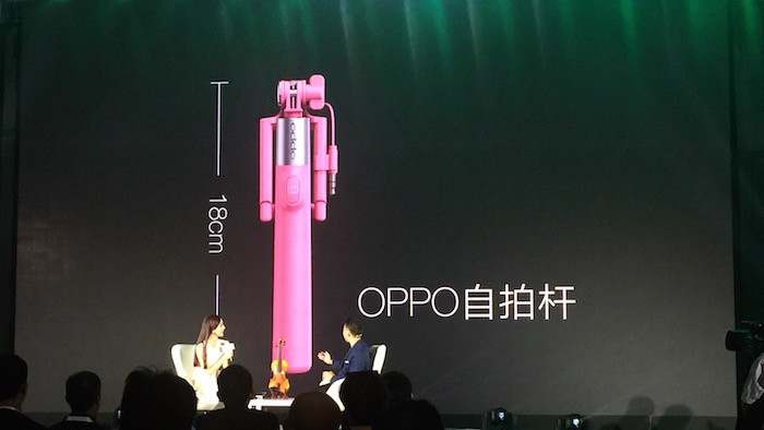 除了全新的手机产品,OPPO新品沟通会最出人意料的还是首次推出OPPO自拍杆,拥有晴空蓝和樱花粉两种颜色,长度为18cm。OPPO号称采用了旗舰手机的标准,在自拍杆表面涂了一层定制手感漆,并且通过排线插入耳机插孔进行控制,而非常见的蓝牙连接。