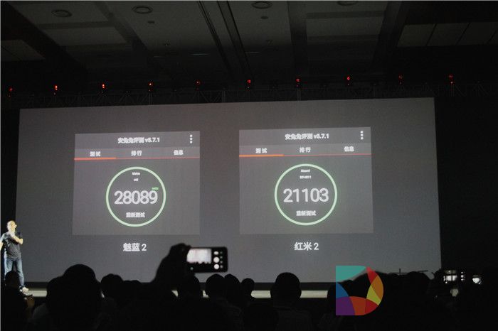 低端市场魅蓝2与主要对手友商红米2的跑分对比,哦对跑分软件也是友商的。