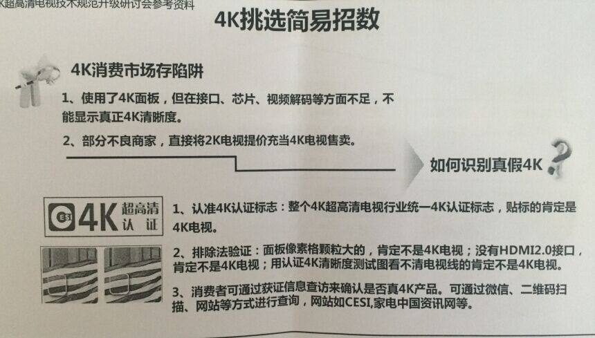 目前国内的4K电视面板多来自于韩国市场,如LG、三星,国内整机厂商进行采买后进行电视组装,专家提醒,“为了节省材料成本,市场上出现了假4K,虽然子像素数与4K相同,但并不是真正的4K,因此消费者在购买时要注意。”虽然4K电视的主要消费群体在中国,但我国目前尚未出台4K电视的正式权威认证标准,标准的缺失致使监管存在空白。