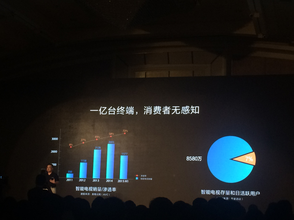 重点来了,三年1200万台的销量掀起了本次会议的小高潮,一千二百万是个什么概念呢?中怡康等数据显示:2014年,中国主流电视厂商创造了总量为3110万的智能电视用户总量,其中,海信以800万位居榜首,TCL、创维分列2、3位。而作为“侵入者”的乐视和小米用户量仅分别为150万和30万。