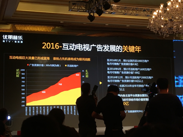 韩怡冰强调,互动电视所形成的巨大流量已经开始形成一个新的巨大的广告蓝海。据业内专家估计,2016年全年,中国互动电视广告可变现资源的总媒体价值规模储量将有望达到400亿元规模。2016年,优朋普乐预计与合作的广电运营商、电信运营商、互联网电视牌照方所共同形成的总媒体广告资源量有望实现近87亿元的总储量规模,这意味着一个已经完全可期的巨大的广告金矿出现,充满着极具魅力的商业价值变现前景。