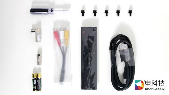 随机附赠的配件包含支架、遥控器、HDMI接线等,与之前的小米电视不同,小米电视3的支架不再采用抽插安装的方式。而小米最新的彩虹电池也没有出现在这里。