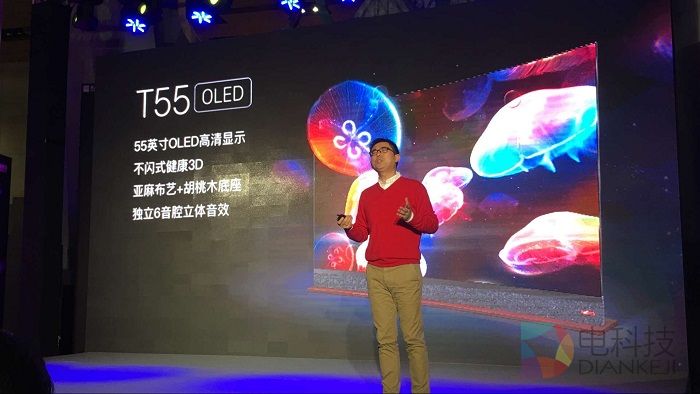 酷开董事长王志国的出现意味着,酷开最新T55 OLED电视终于要亮相了,作为首款互联网品牌OLED电视,在显示上采用了OLED NTSC 108%全色域显示。