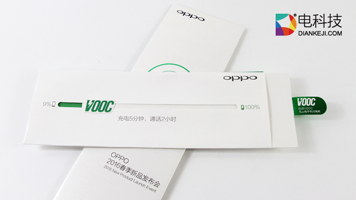 邀请函除了依旧主打OPPO一贯的白绿配色,在设计内容上也是突出一直以来的宣传口号,“充电5分钟,通话2小时”。
