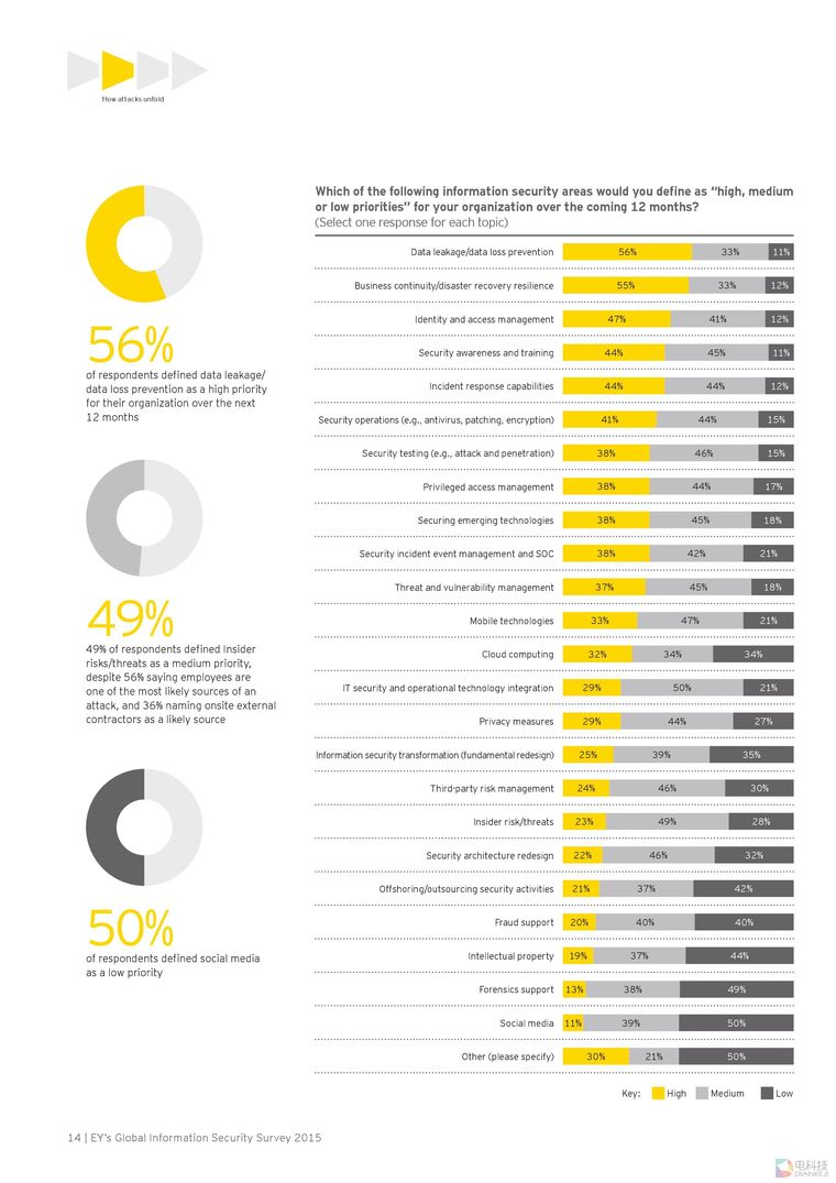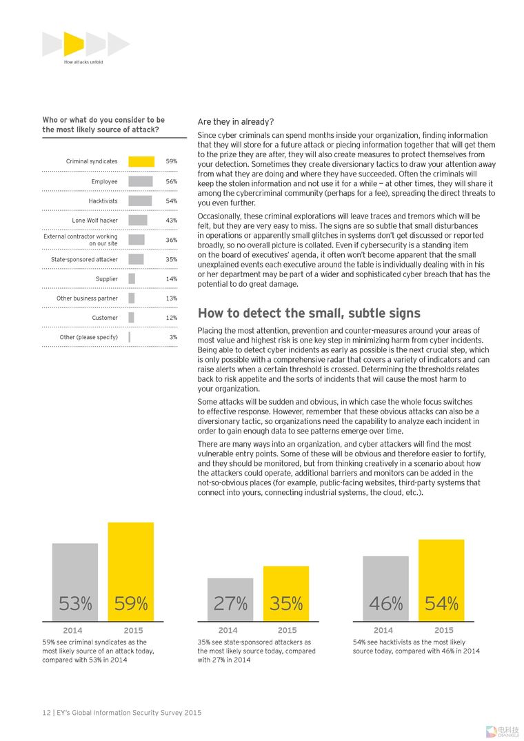 调查显示,超过三成全球受访企业表示他们依然无法识别出复杂的网络攻击。犯罪集团(59%)、内部员工(56%)和黑客组织(54%)是排名前三位的最有可能的网络攻击来源,同时,国家背景攻击者(35%)列于该榜单的第六位。然而,与安永去年的调查结果相比,受访者对犯罪集团、黑客组织和国家背景攻击者的评分有所提高,2014年各项的评分分别是犯罪集团(53%)、内部员工(46%)和黑客组织(27%)。