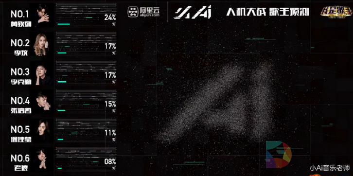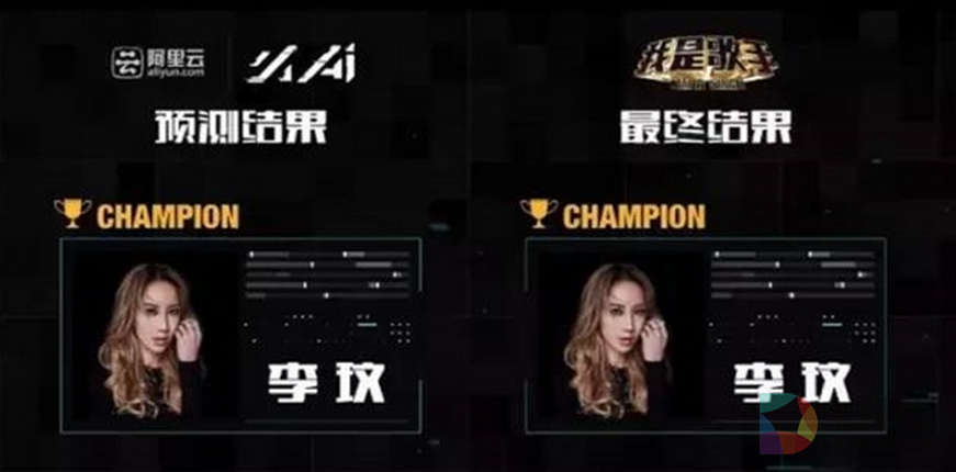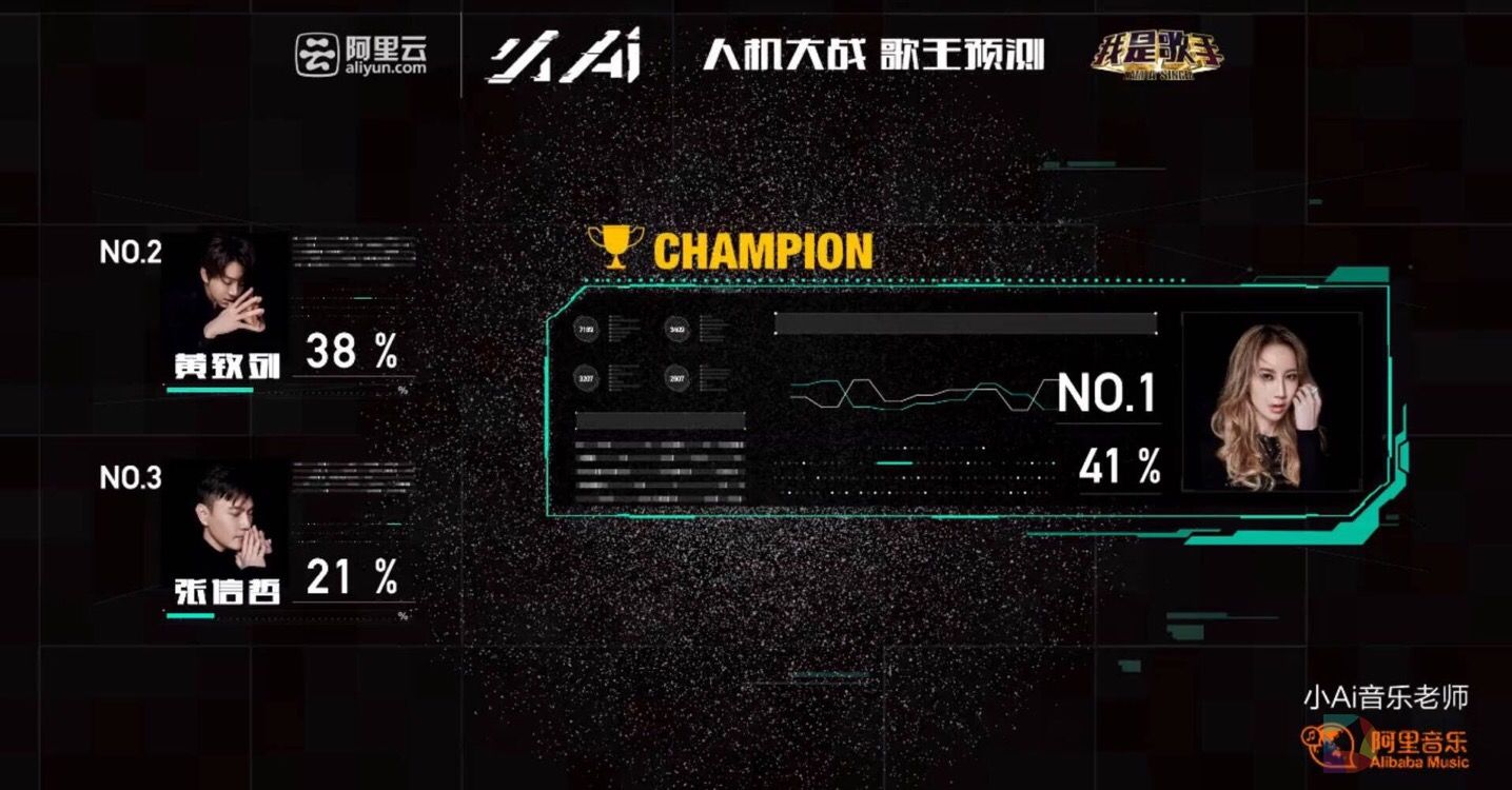 作为评委,阿里云小Ai全程参与《我是歌手》的总决赛。在七进六帮帮唱环节,小Ai准确预测出容祖儿被淘汰。六进三两两演唱PK环节,小Ai准确预测出了获胜者张信哲、黄致列、李玟。歌王争霸环节,小Ai以42%的胜率一举命中总决赛歌王李玟,在三轮比赛中完全预测准确。