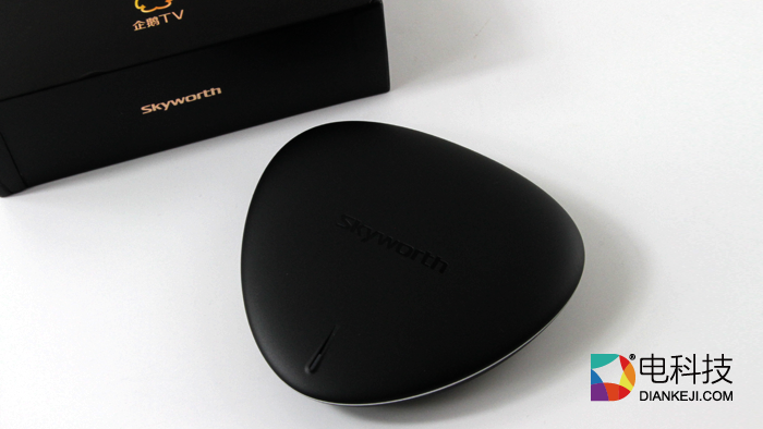 机顶刻有Skyworth创维的品牌logo,在纯黑色背景下不甚显眼。前端设计有一枚工作状态灯,是机顶唯一一个“装饰物”。