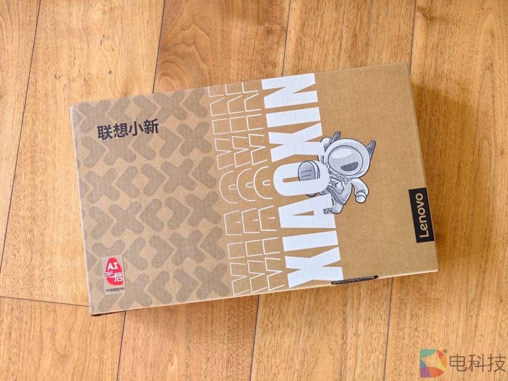 正式开箱,包装盒还是颇具辨识度的联想小新系列,牛皮纸底色搭配 “XIAOXIN” 超大白色字体,左侧的卡通形象活力满满,“联想小新” 和 “AI 元启” 标识清晰点明身份,右下角的 Lenovo Logo 则是品质的直观印记。背面的正版 Office 家庭版标签以及能效标签,将产品的基础信息和细节一一呈现。