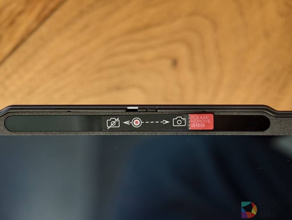 翻开屏幕,B 面的窄边框设计让屏占比颇为可观。屏幕上方的摄像头区域配备了物理开关滑块,红色 “请移除” 标识清晰提醒用户使用前的操作,这一细节在隐私保护上相当贴心。
