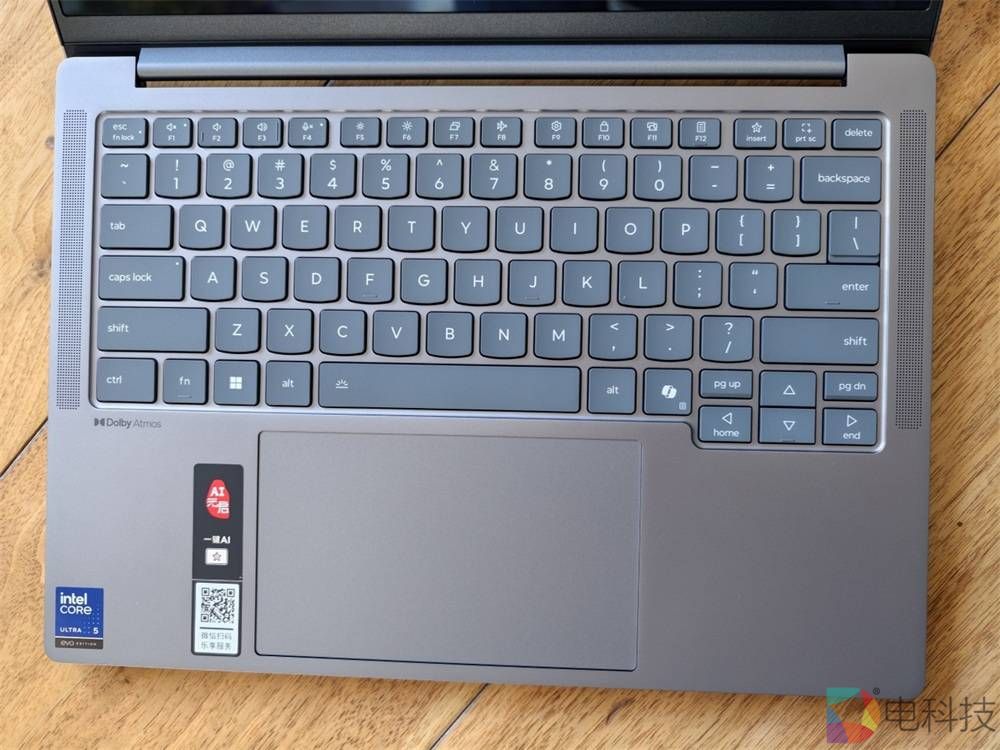 目光下移至C 面,键盘区域上方的 “Intel Core Ultra 5” 与 “AI 元启” 贴纸标注了核心配置。全尺寸键盘布局合理,键帽回馈感适中,日常打字的舒适度有保障。大面积的触控板表面顺滑,手势操作的跟手性值得期待。此外,C 面还印有 “Dolby Atmos” 标识,暗示着音频体验的不俗表现。