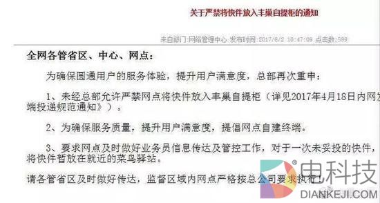 实际上,此前就有据网友爆料称,圆通速递今天在内网发布通知称,严禁将快件放入顺丰旗下丰巢自提柜,提倡自建终端,对于一次性未妥投的快件,可以放在就近的菜鸟驿站,圆通内部要求严格执行相关政策。