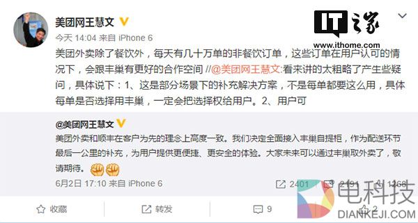 IT之家6月3日消息 昨天顺丰和菜鸟之间关于数据接口的纠纷成为外界关注的焦点,顺丰和菜鸟“打架”,引来众多“兄弟企业”发声、站队,其中包括京东、腾讯和美团等。不过,关于美团选择全面接入丰巢,力挺顺丰,却引来不少网友的调侃。