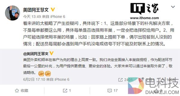 针对网友们的质疑,美团网副总裁王惠文对昨天的发言进行了澄清,他在微博上说:“看来讲的太粗略了产生些疑问,具体说下:1、这是部分场景下的补充解决方案,不是每单都要这么用,具体每单是否选择用丰巢,一定会把选择权给用户。2、用户可能选择使用丰巢的场景,比如:回家路上提前下单,偶尔出现餐到人没到的情况;配送员每周都会遇到用户手机没电或信号不好不能及时联系上的情况。”随后又补充:“美团外卖除了餐饮外,每天有几十万单的非餐饮订单,这些订单在用户认可的情况下,会跟丰巢有更好的合作空间”。