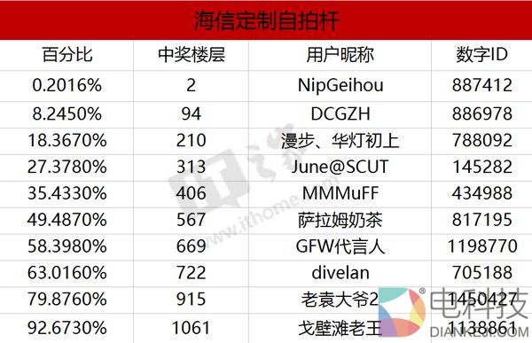截至2月23日16:00活动结束时,《双屏双面:海信双屏手机A2发布会有奖图文直播》一文评论楼层为1145楼,以海信定制自拍杆第一位获奖者为例,获奖楼层应该是1145×0.2016%≈2.308,四舍五入后即为第2楼,因此第2楼昵称为NipGeihou(1189489)的用户获得该奖品,括号中为该用户的数字ID。