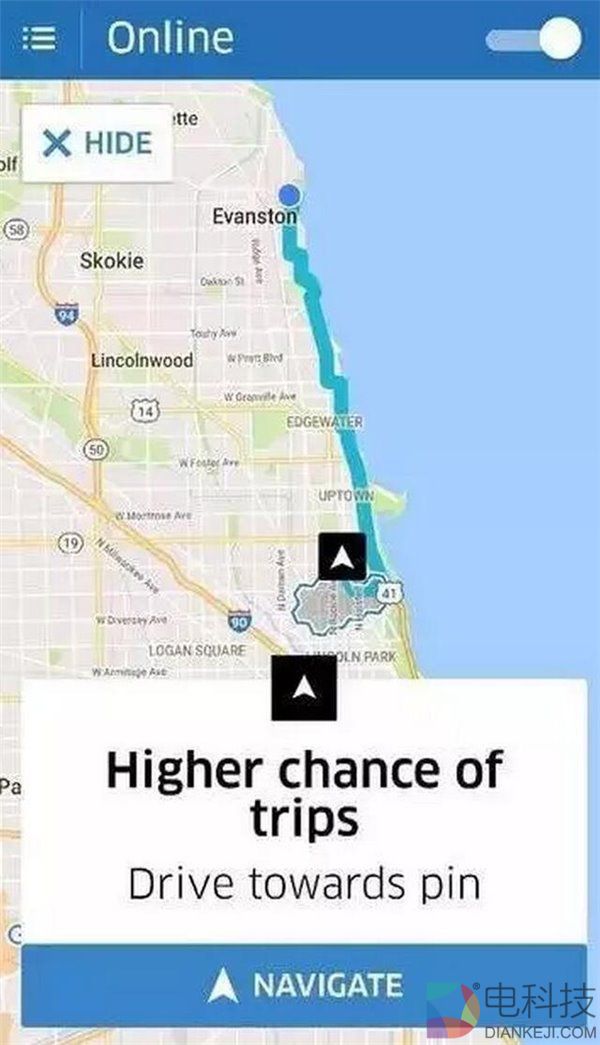 为了达到这个目的,Uber用了一些增加司机供应量的心理技巧,非常的有效。比如,一种叫做“提前派单”的算法——-它会在当前任务未完成之前向专车司机派遣新任务。这样既缩短了乘客的等待时间,又可以让司机一直忙碌,防止司机空闲过长时间而离开平台。这很像是当一部电视剧集的播出接近尾声时,电视台都会自动向用户提示下一部剧集。马修·皮特曼和金·希恩盖指出:“事实上,这种做法更像是阻挠用户离开电视台服务,而不是继续观看电视剧集。”