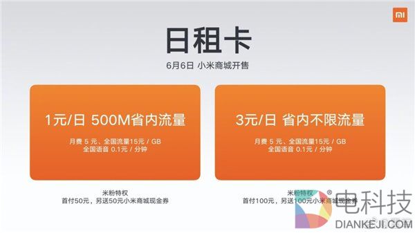 IT之家5月27日消息 如无意外6月6日小米商城官方将会开售小米米粉卡,根据已经公开的信息显示,小米下月初将要发布的米粉卡将会有两种规格,除了月租5元、1元500MB流量的“1元日租卡”之外,更受关注的是“不限量日租卡”,用户只需五元每月的月租外加3元/天就可以获得不限量的无限流量上网(当然超过40GB、100GB之后依然还是限速)。