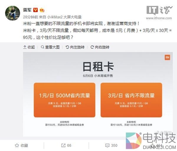 雷军称,米粉一直想要的不限流量的手机卡即将实现,谢谢运营商支持。米粉卡3元/天不限流量,假如每天都用,成本是5元(月费)+ 3元/天 x 30天=95元,由于此前已经宣布小米与中国电信达成合作,因此此次发布的不限量日租米粉卡应该会走中国电信网络。