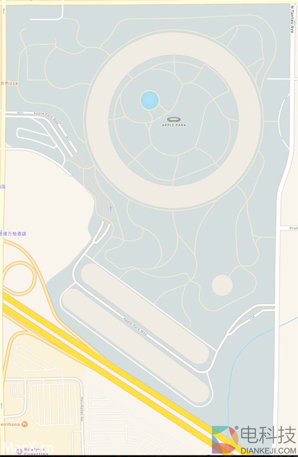 地图中的信息还是比较丰富的,苹果Apple Park所有建筑物都已经囊括其中,包括尚未建成的部分(比如游客中心、附属研发中心等)。除了建筑物,你还可以在其中看到Apple Park中的人行步道的分布,包括环形主楼中庭院部分的步道。