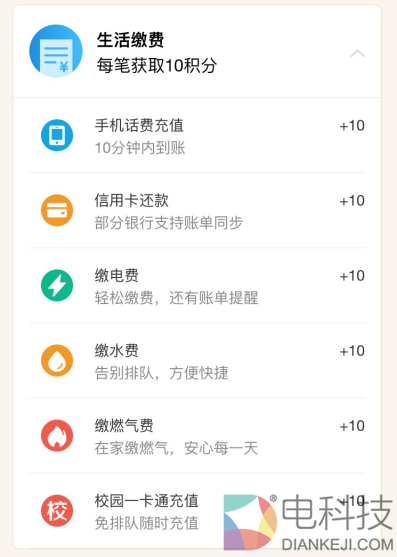 水电煤缴费、信用卡还贷、话费充值,这些在支付宝中给大家带来便利的功能,同样也能让你获取积分,消费者每笔生活缴费能获取10积分。
