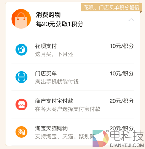 在消费购物时使用支付宝,每20元你就能获取1积分,而如果你选择了线下门店支付、花呗支付,奖励就会翻倍,每10元就能获取1积分。