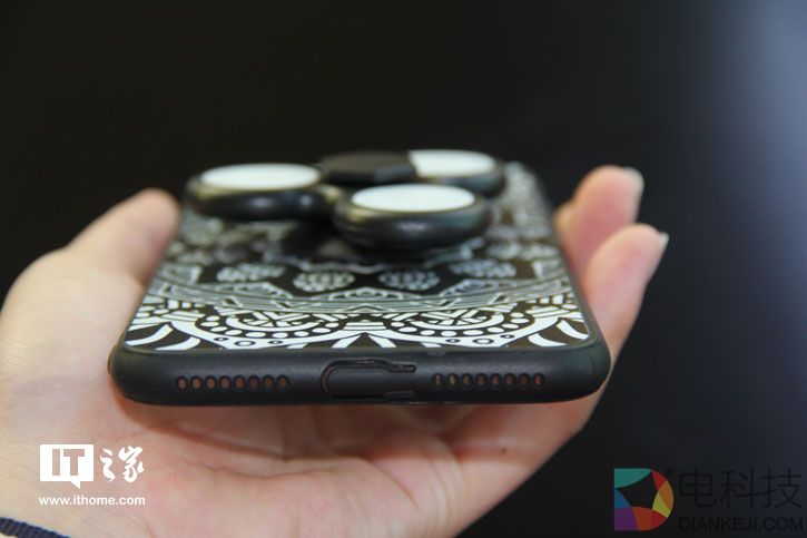 目前该保护壳适用于iPhone7和iPhone7 Plus,保护壳的背面有一个小巧的指尖陀螺,用户可以将指尖陀螺卸下来,也可以就让其放在上面,怎么玩都行。